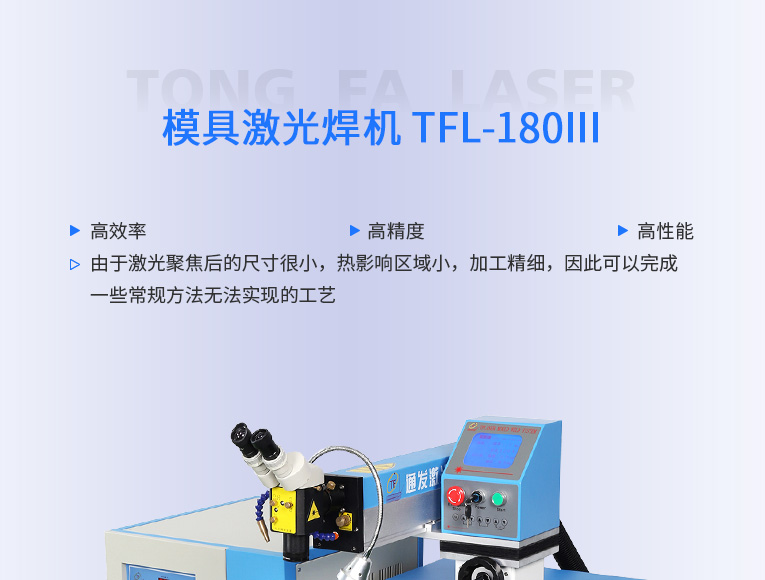 普通型模具激光焊機(jī)TFL-180Ⅲ是通發(fā)激光公司的模具激光焊機(jī)中銷量較大的傳統(tǒng)型,配置激光頭手搖升降與工作臺按鈕電動升降實(shí)現(xiàn)焊接不同厚度模具的激光焊加工。本系列機(jī)型適用于各類精密注塑模具激光補(bǔ)焊、壓鑄模具激光修補(bǔ)焊接;同時(shí)也適合鑄件沙孔激光修補(bǔ)、模具磨損激光修復(fù)、過切加工等的激光修補(bǔ);各類金屬結(jié)構(gòu)件激光焊接加工、金銀首飾激光焊接加工。