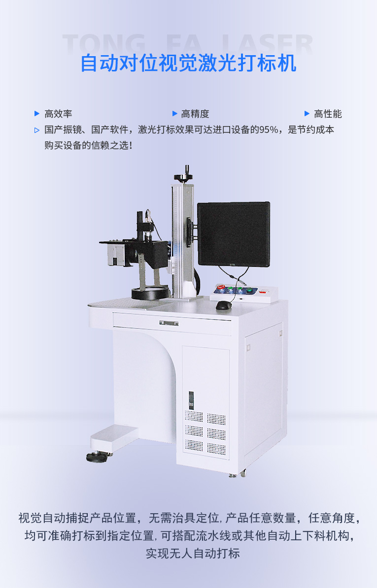 通發激光研發的自動對位視覺激光打標機TFL-F20CY-ZD,視覺自動捕捉產品位置,無需治具定位,產品任意數量,任意角度,均可準確打標到指定位置,可搭配流水線或其他自動上下料機構,節省人力,實現無人自動打標,可搭配流水線或其他自動上下料機構,節省人力,實現無人自動打標,極高的重復頻率,打標速度快;極高的光學質量,實現精細打標,可與光纖、CO2、半導體等各種波長的激光光路集成.